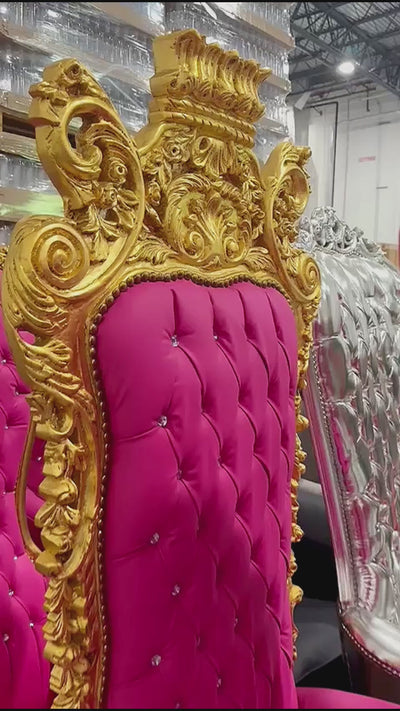 From my new line of reproduction chairs, i bring this beautiful unique and authentic Throne Chair frame refinished in gold and reupholstered in pink tufted leather. The chair was made in France and upholstery done in Italy. Entire chair was hand-carved and frame is decorated with floral motifs to accent the front and back of this very comfortable, sumptuously padded chair with a detachable cushion.