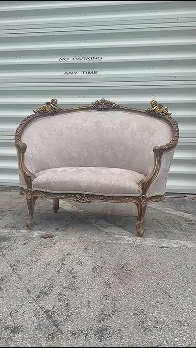 If you're looking for a romantic and artistic piece, this stunning sofa is the perfect choice. The fabric features exquisite designs with great attention to detail that evoke classic French charm, and it comes with matching cushions that enhance its elegant appearance. The gold leaf angel carvings add a touch of timeless refinement, blending art and function beautifully. Designed to elevate any space, this piece is upholstered for both elegance and comfort.