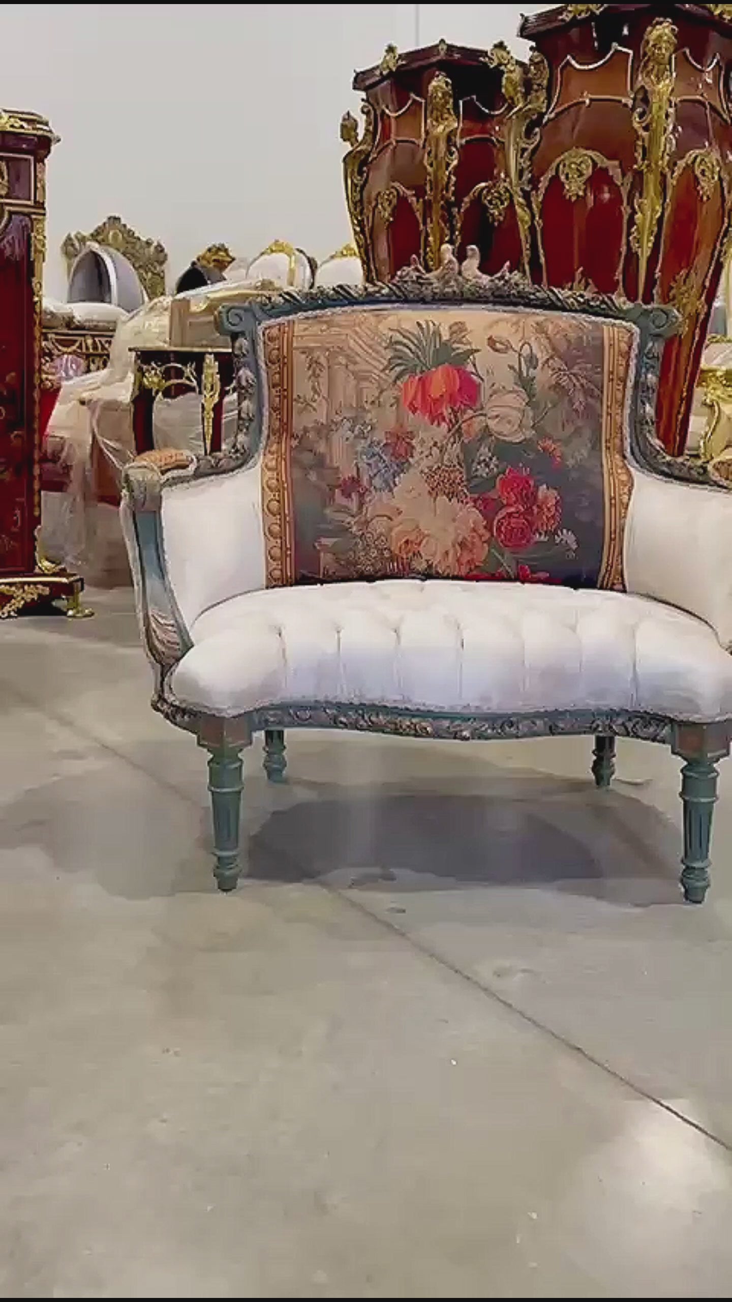 This chair is absolutely stunning! Expertly refinished and reupholstered with luxurious designer damask fabric and soft beige velvet, they offer both timeless elegance and modern charm. The romantic, intricate design on the backrest chair adds a touch of sophistication, making them perfect for special occasions or as a striking centerpiece in your living room. A true statement piece that blends style, comfort, and craftsmanship. Don’t miss out on this beautiful addition to your home!