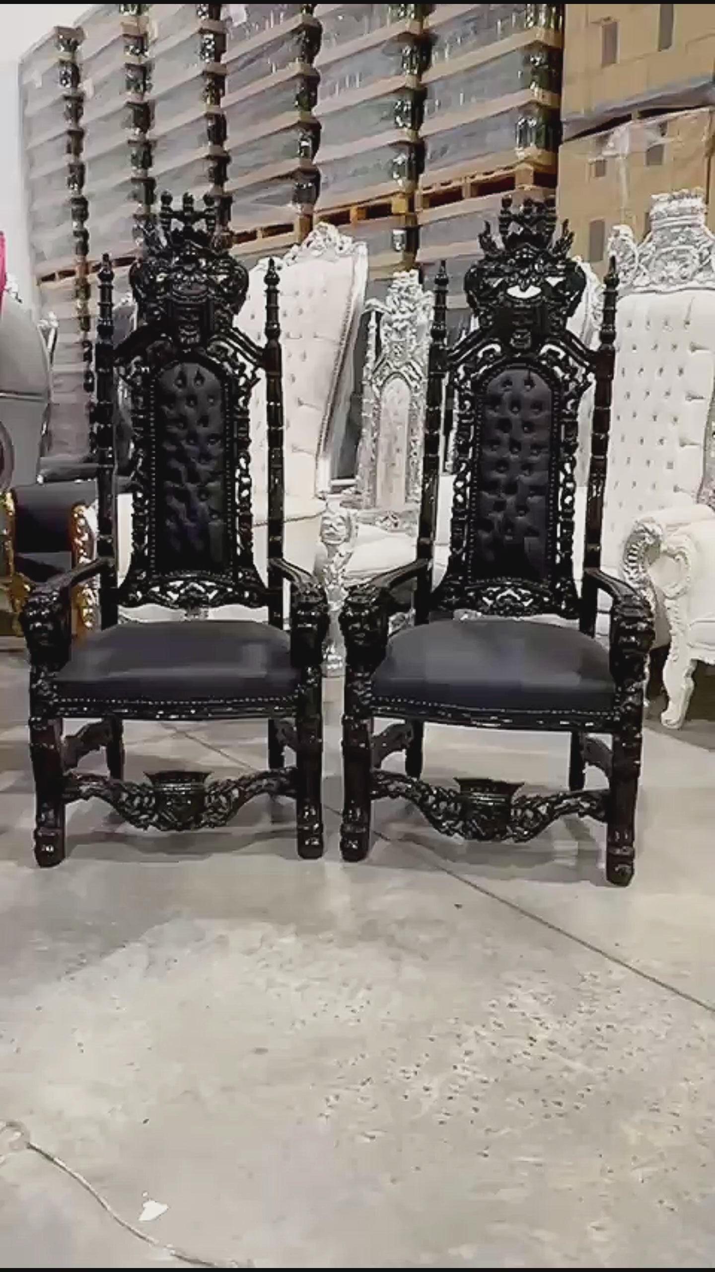 This stunning King-Style chair is a true statement piece, with exquisite details that will elevate any space in your home. Refinished in sleek black lacquer and reupholstered with luxurious black leather, it combines both beauty and durability. This heavy-duty chair is a timeless addition to your decor.