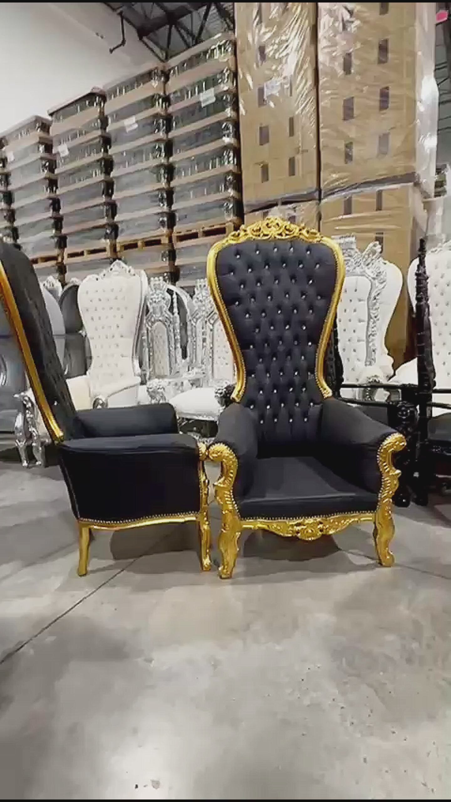 Throne Chair French Style Black Leather High-Back Tufted Gold Throne