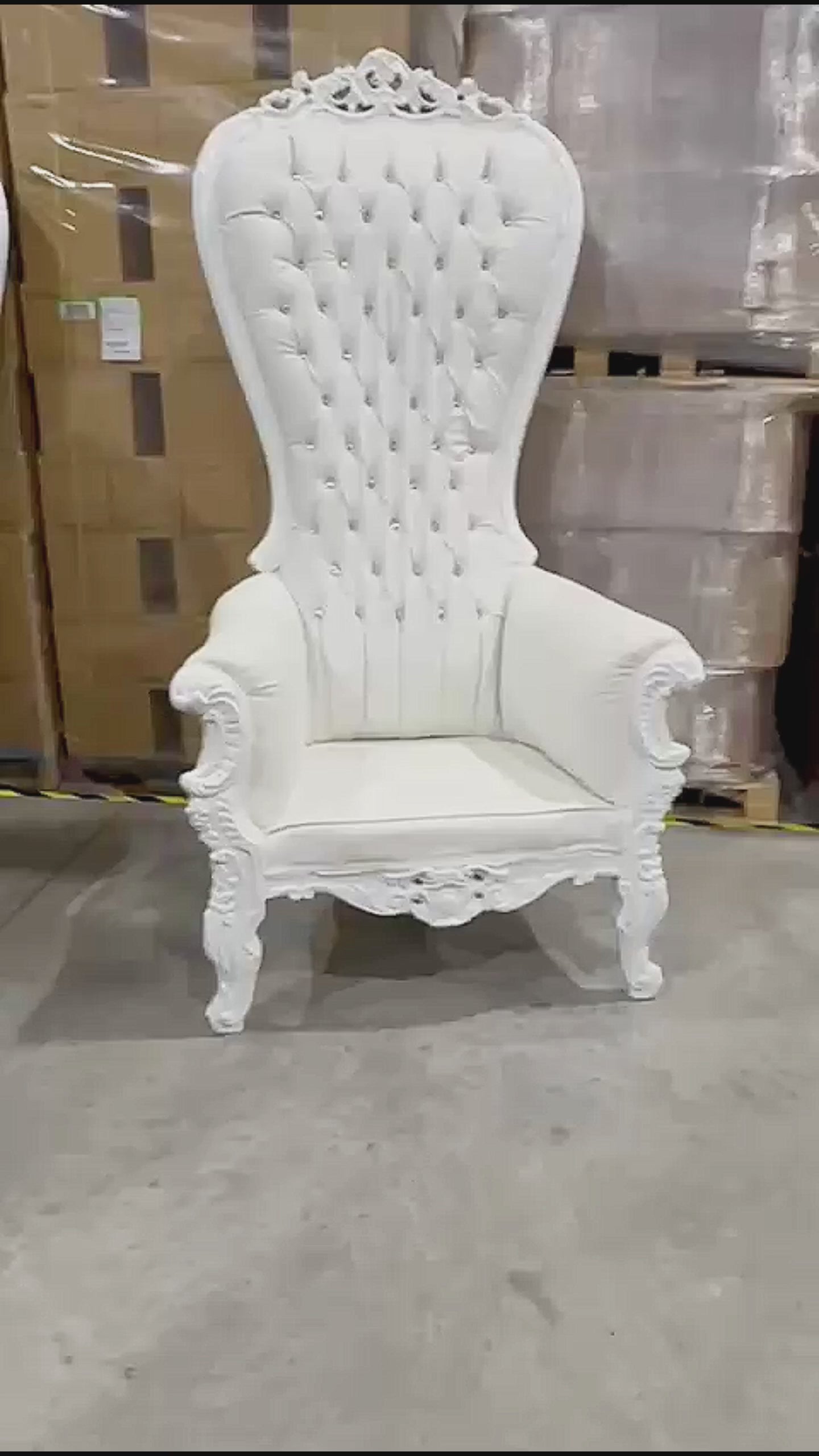 I proudly present this exquisite Throne Chair, meticulously crafted and finished to perfection. Featuring a stunnig hand-carved frame in gold, this chair is a stament of elegance and sophistication. Reupholstered with white leather fabric. Made in France and Upholstered in Italy, This chair combines the best of European craftsmanship. The frame is adorned with intricate floral motifs. The trhone chair offers exceptional comfort with sumptuous padding and detechable cushion. The tufting is highlighted with sparkling crystal glass accents.