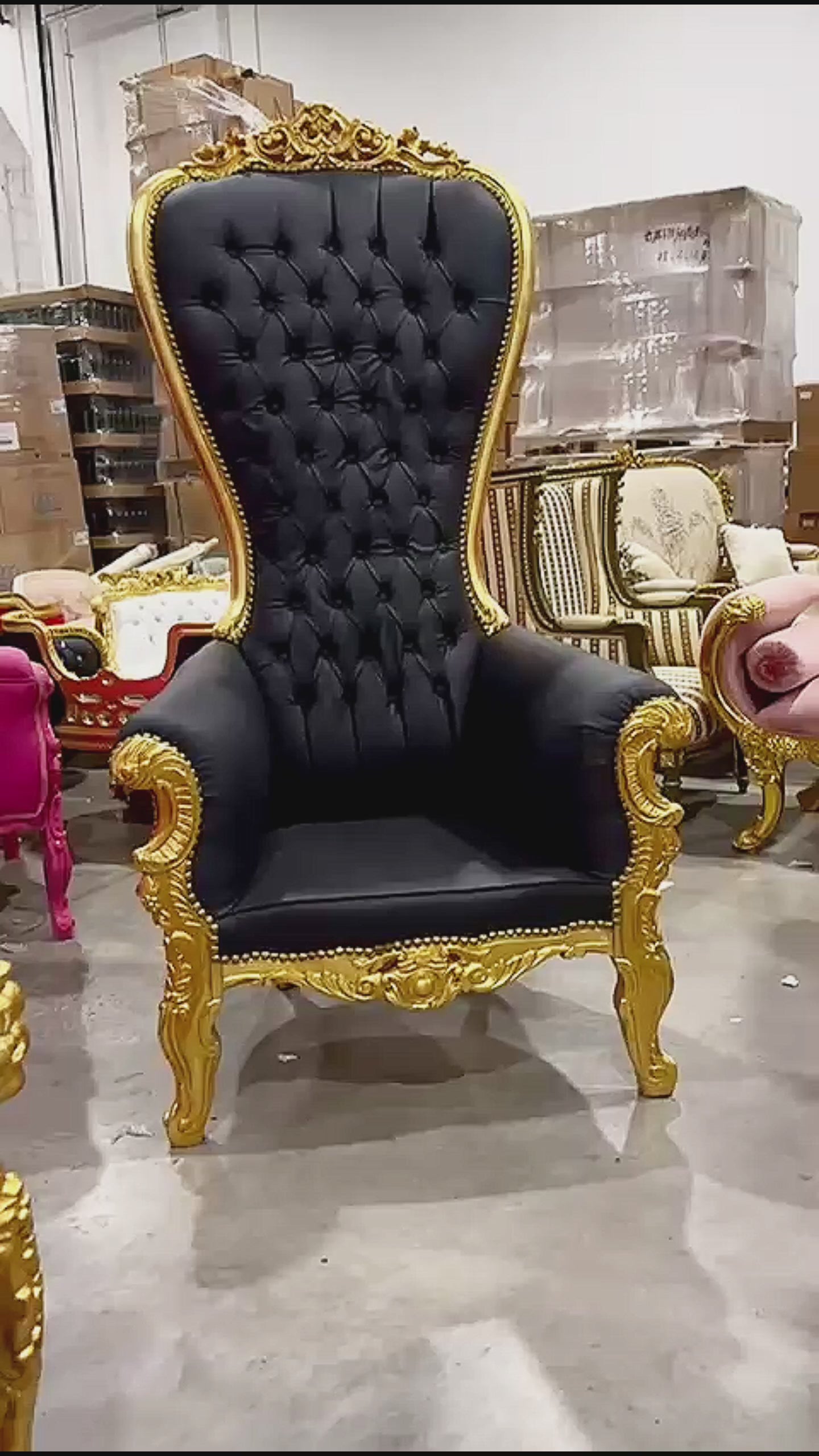 Throne Chair French Style Black Leather High-Back Tufted Gold Leaf Details