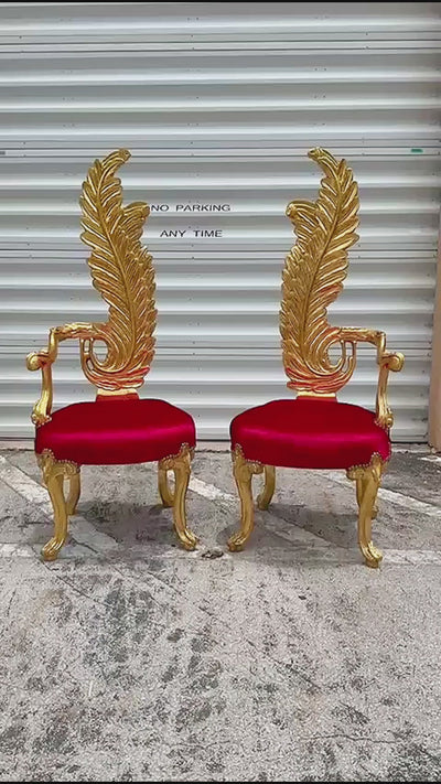 Lovely tall red velvet chair refinished in 24K gold leaf. Tufted sitting using a high end designer velvet fabric. I finished the trim using nail heads and added crystal glass to the tufting seat. I have a pair willing to split the set.