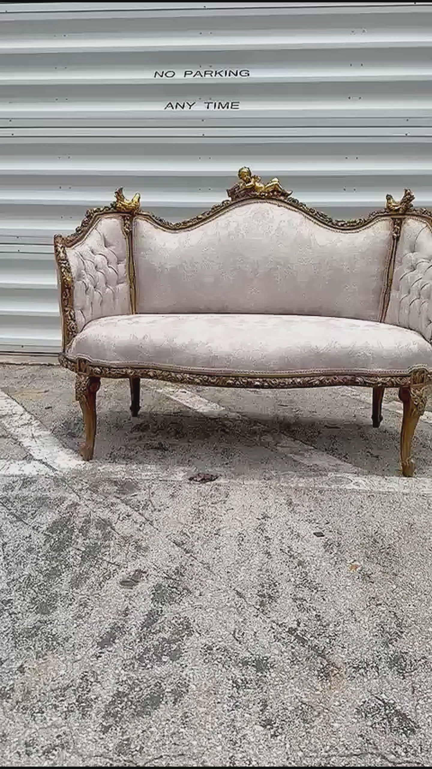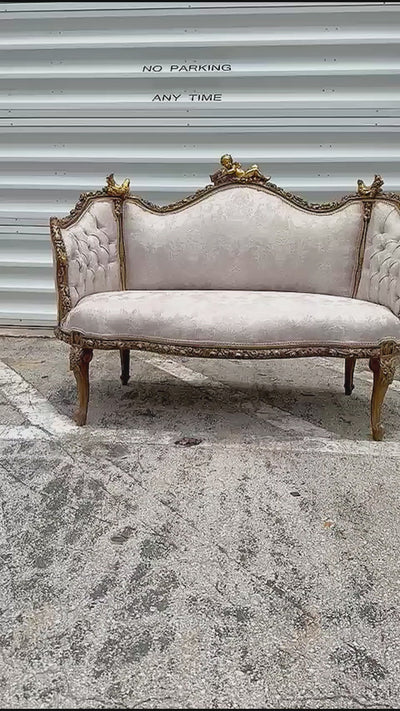 Fall in love with the timeless beauty of this exquisite sofa, which features intricate carvings and elegant gold leaf accents. The hand-carved frame features a beautiful angel motif at its centre, adding a romantic and artistic touch that sets this piece apart. The fully refinished sofa boasts brand-new padding and luxurious, high-end designer upholstery in a sophisticated tan-beige colour. Offering both elegance and comfort, it is perfect for refined interiors.