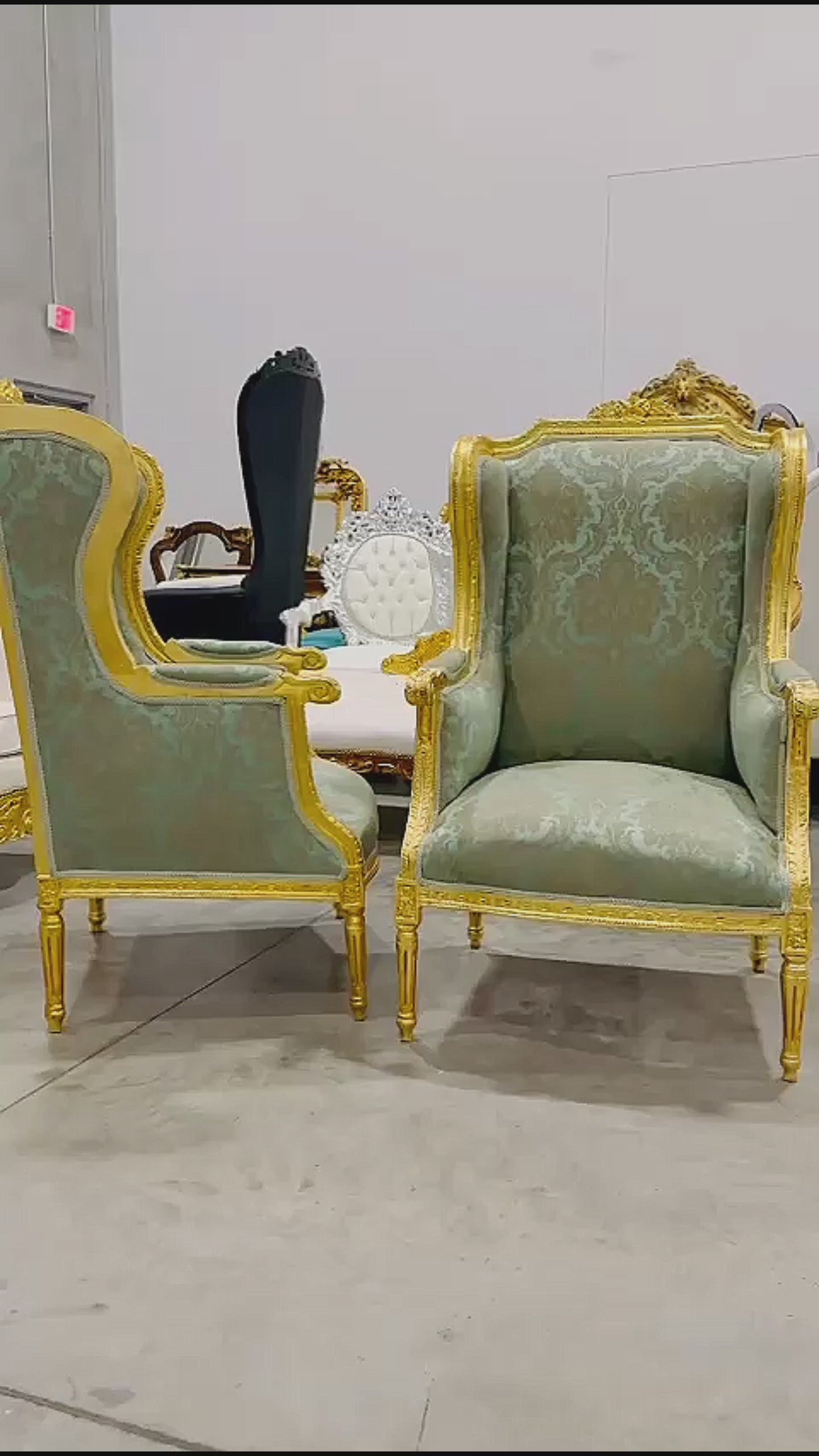 Green Bergere Wing Chair with Gold Details French Louis XV Style