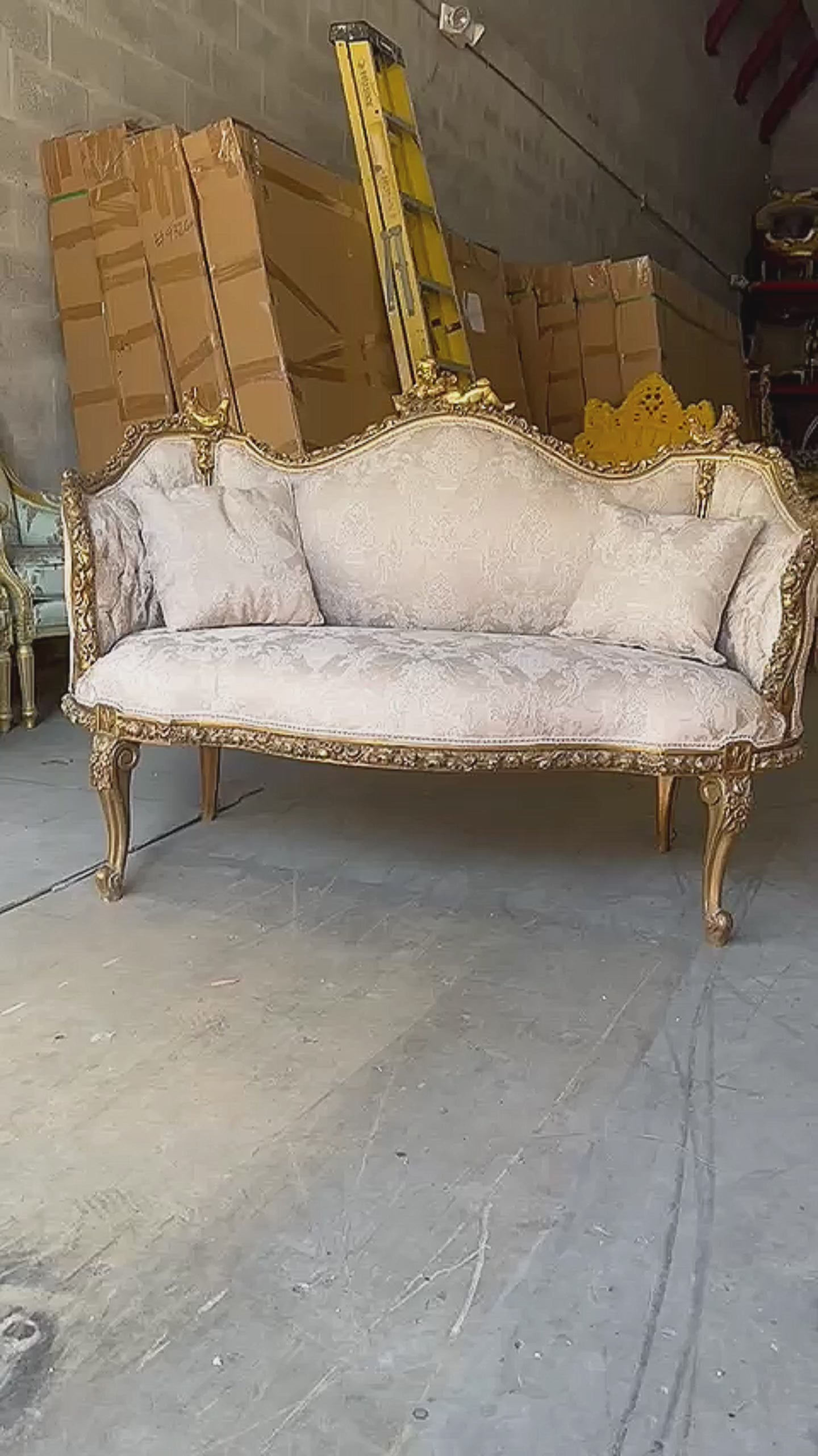 Fall in love with the timeless beauty of this exquisite sofa, which features intricate carvings and elegant gold leaf accents. The hand-carved frame features a beautiful angel motif at its centre, adding a romantic and artistic touch that sets this piece apart. The fully refinished sofa boasts brand-new padding and luxurious, high-end designer upholstery in a sophisticated tan-beige colour. Offering both elegance and comfort, it is perfect for refined interiors.