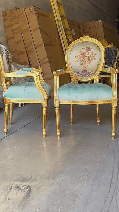 French Style Sky Blue Velvet Chair with Gold Details Rococo Baroque