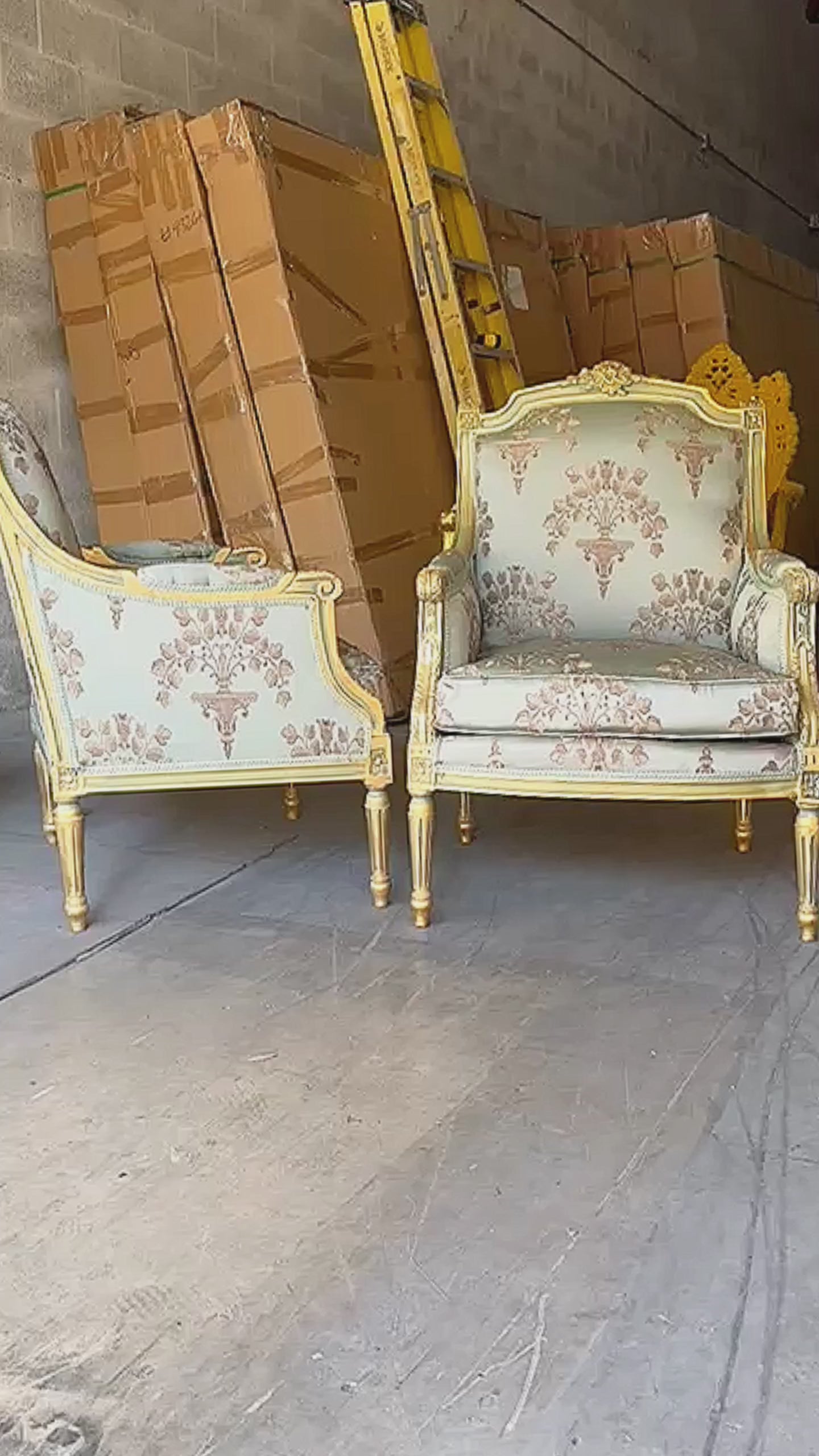 I'm obsessed with this chair! It has been fully refinished and reupholstered in a luxurious green-blue designer damask fabric. The craftsmanship and attention to detail are unparalleled. This stunning chair is currently in stock, so don't miss your chance to buy it!