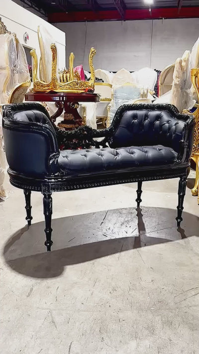 Tufted Bench Black Leather French Style Black Details Rococo Baroque Furniture