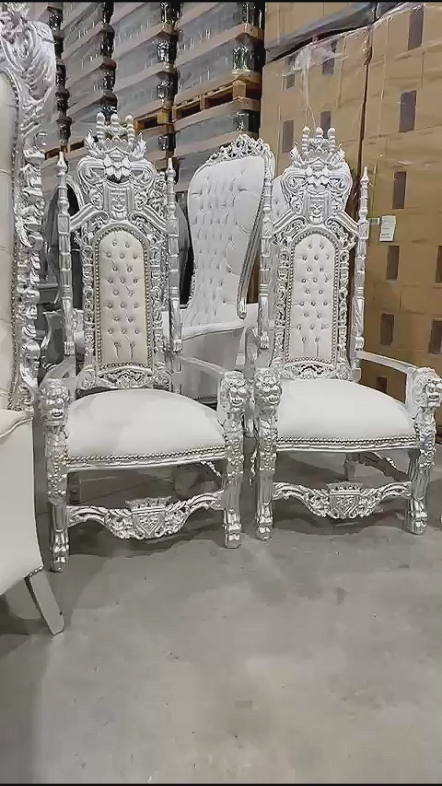 In love with the design. Beautiful adult King Chair refinished in Silver Leaf and reupholster using white leather. This is a beautiful heavy duty chair. The trim was finished in gold nail heads and added crystal glass buttons to the tufted to give it a pop.