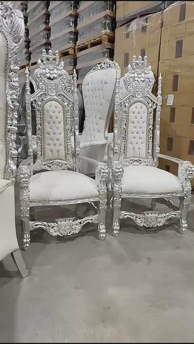 King Throne Chair with White Leather Silver Leaf Details French Medieval Style