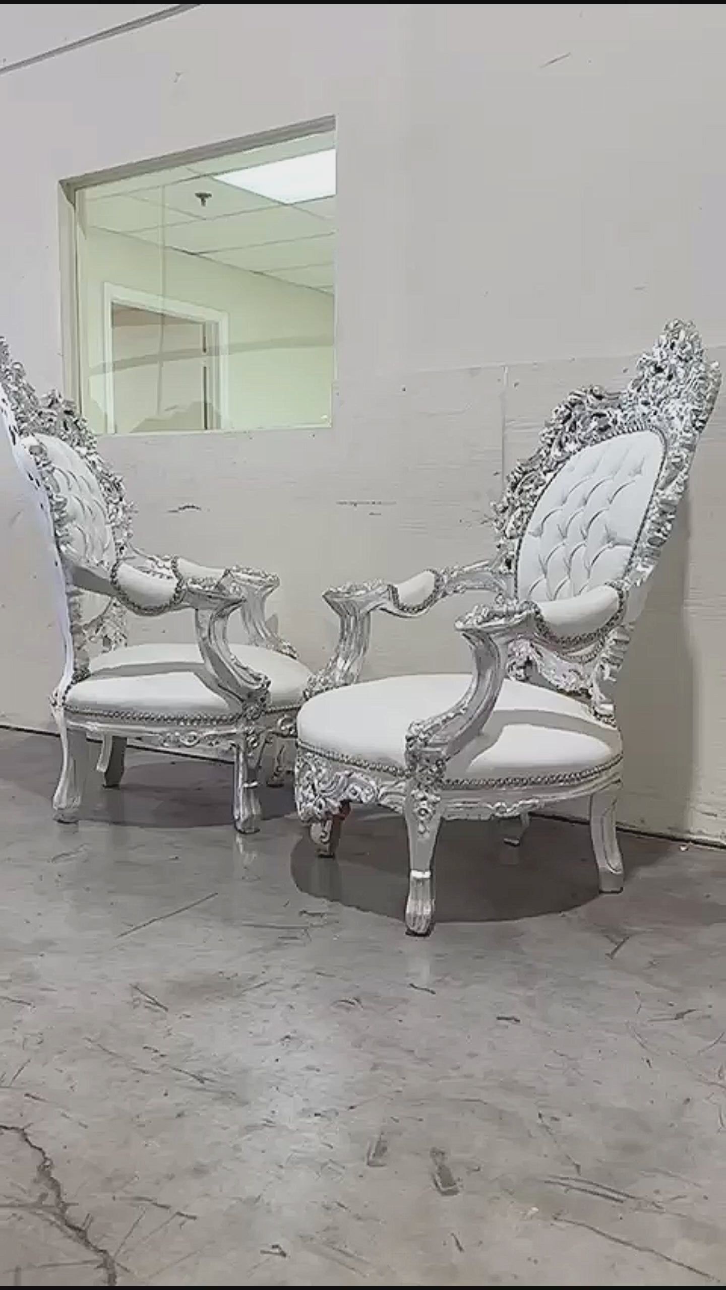 In love with the color of this chair. It is made of white fabric with silver leaf details. Give an extraordinary touch to your home with this chair. This piece is in good condition and ready for use. I finished the trim in a beautiful thick silver nail head and used special crystal glass buttons to finish the tufting part of the back rest of the chair.