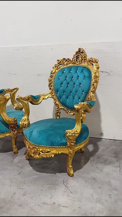 French Style Louis XVI Turquoise Velvet Armchair Chair with Gold Details
