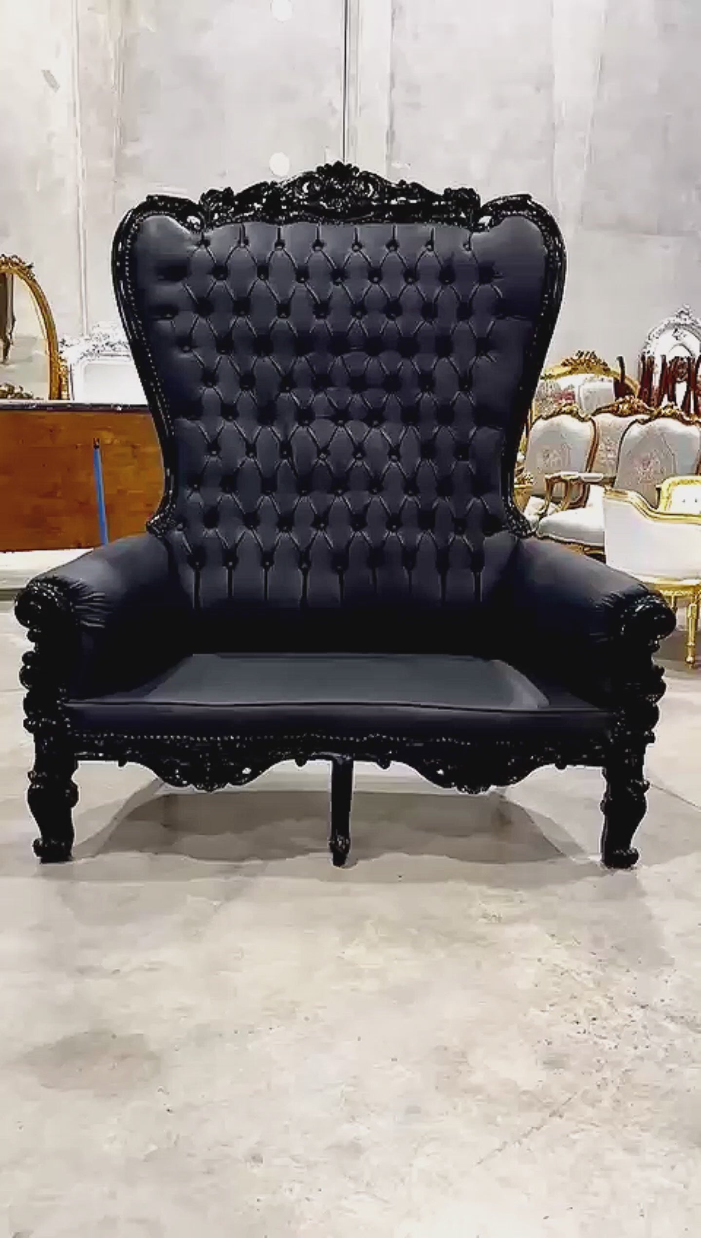 Introducing this exclusive and elegant Adult Double Throne Chair, part of our new line of HIGH QUALITY reproduction chairs. With a black lacquered frame and upholstered in luxurious quilted black leather, this chair is a unique piece that combines comfort and sophistication. Made in France and with upholstery handcrafted in Italy, every detail has been carefully carved, with floral embellishments enhancing both the front and back of the frame.