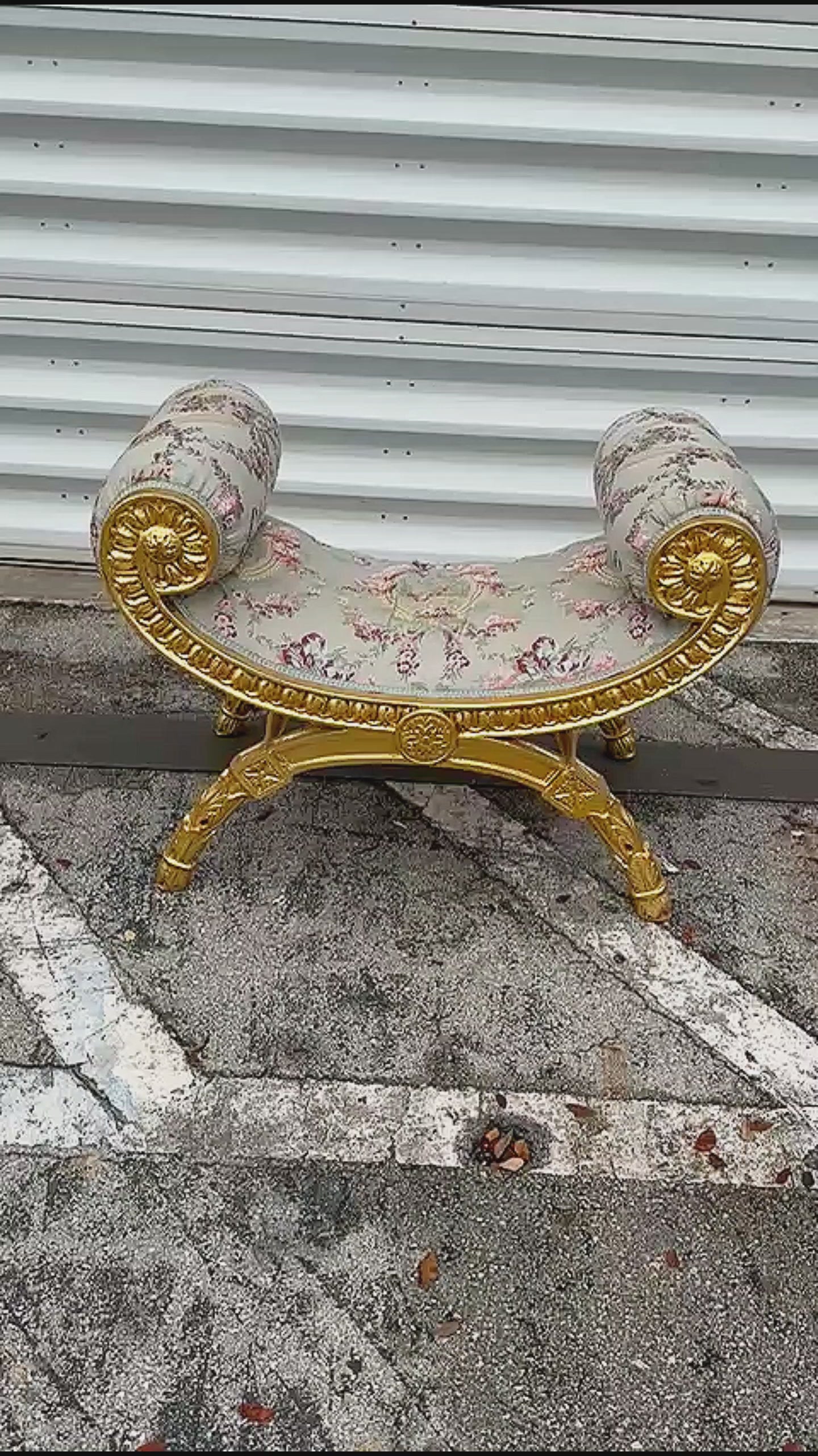 Refinished in genuine gold leaf, the frame showcases intricate accents that add a touch of timeless luxury. The seat is upholstered in a high-end designer damask fabric, offering style and comfort. It also features brand new padding for added support.