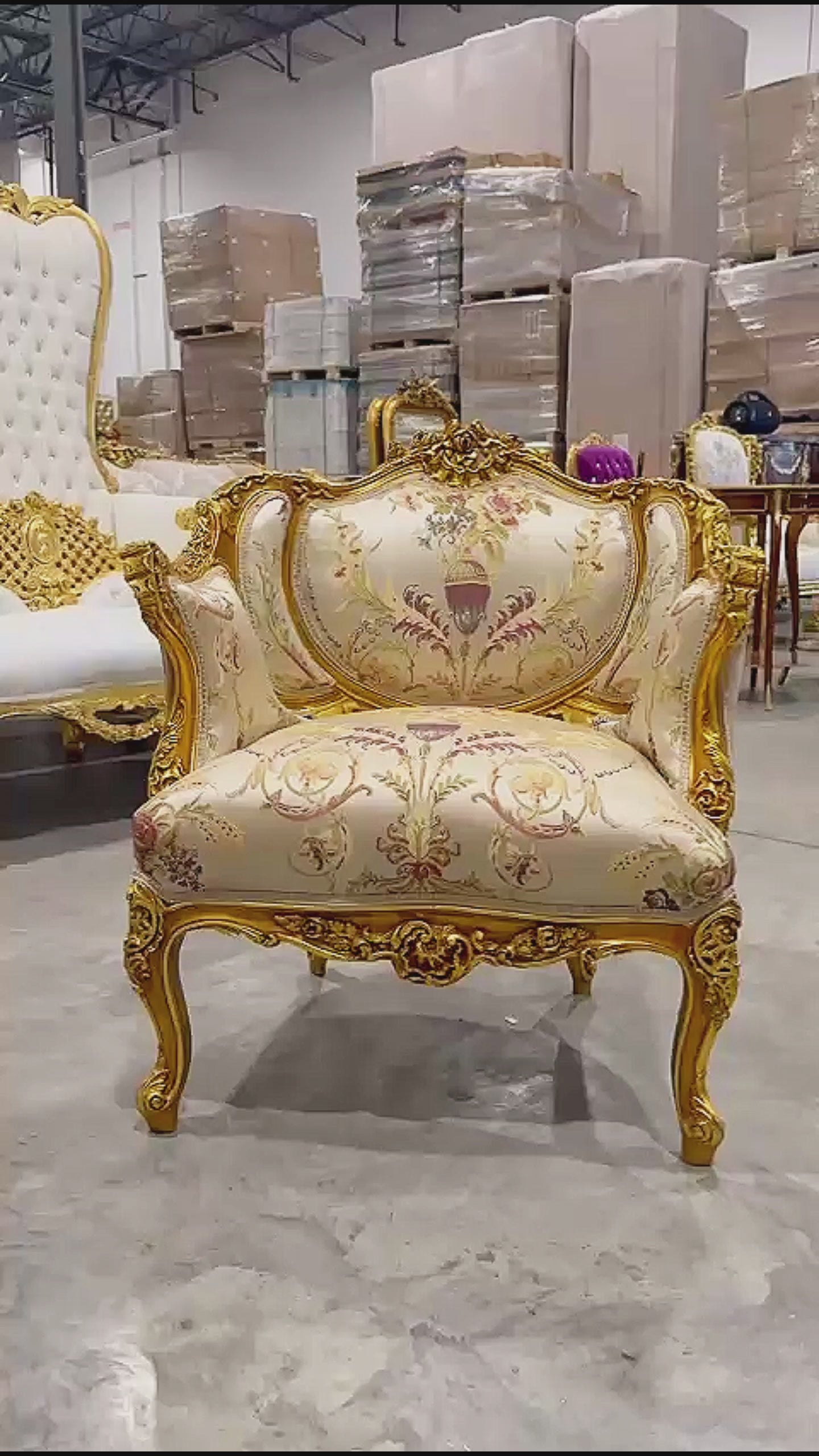 French Rococo style chair with an elegant gold leaf frame, evoking the sophistication and luxury of the period. The piece features an intricate and detailed design, with embellishments that reflect the exquisite craftsmanship of Rococo. The upholstery is made of line damask fabric, a high quality material that adds a touch of texture and elegance. Its combination of colors and patterns offers a perfect harmony between classic and contemporary, making it ideal for spaces that seek a distinguished air full of history. Perfect for adding a touch of distinction to your home or office. A unique piece that cannot be missing in your collection!