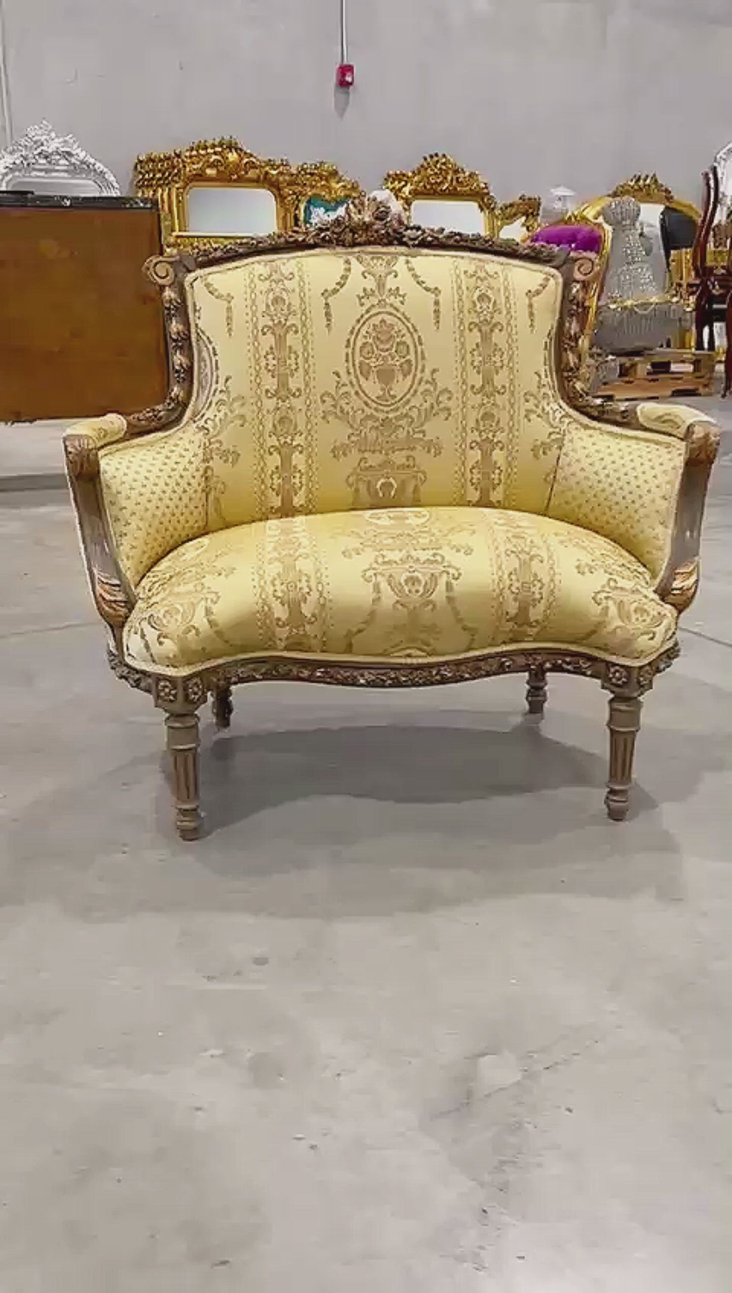Golden Bergere Chair Rococo Style with Gold Details Damask Fabric