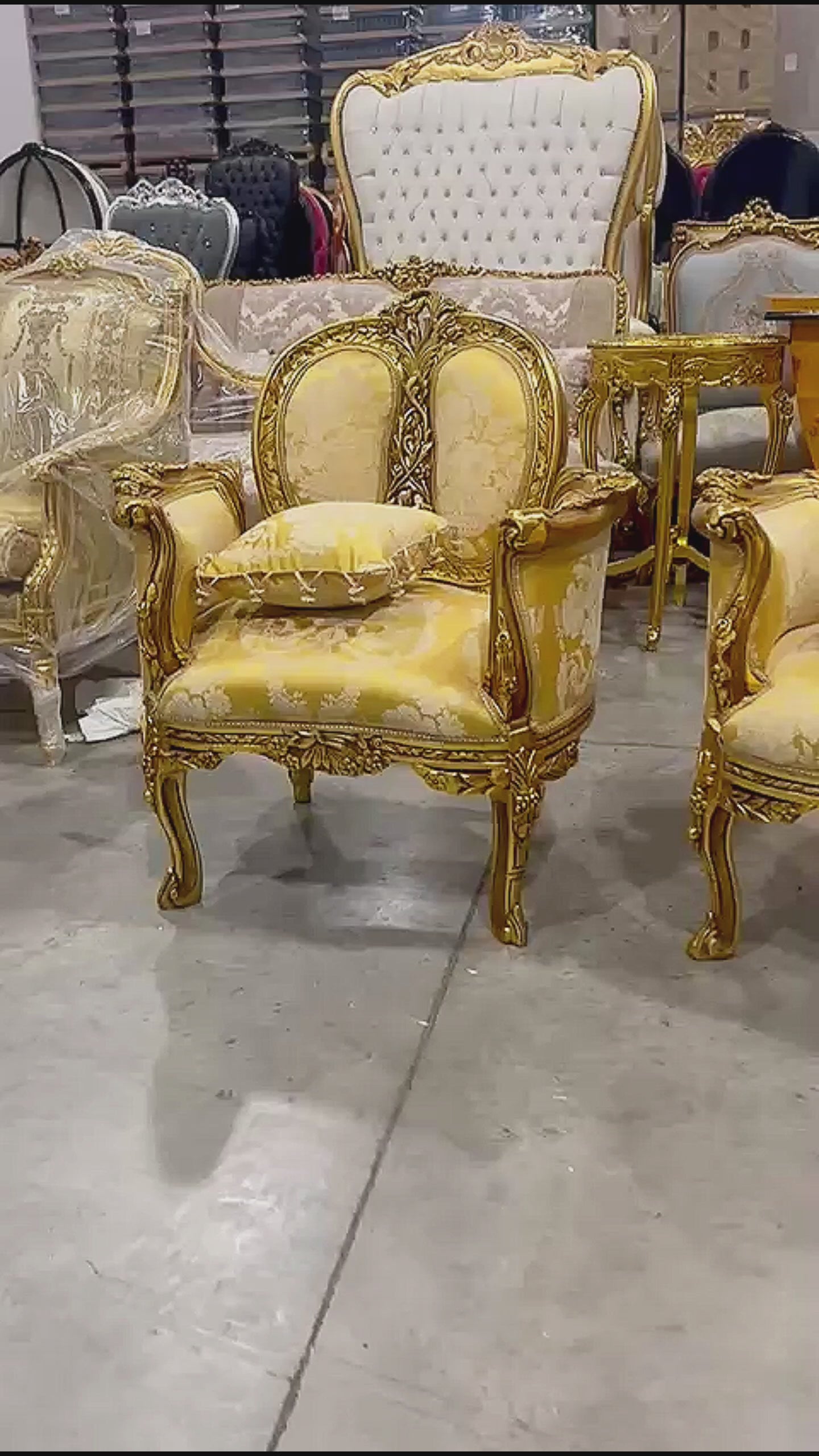 Upholstered in unique, high-end gold damask fabric with an intricate pattern, it adds a touch of sophistication to complement the ornate frame. The carved detailing and rich gold finish showcase the artistry of classic French design. It is perfect for vintage interiors, luxury living spaces, or as a standout accent piece.