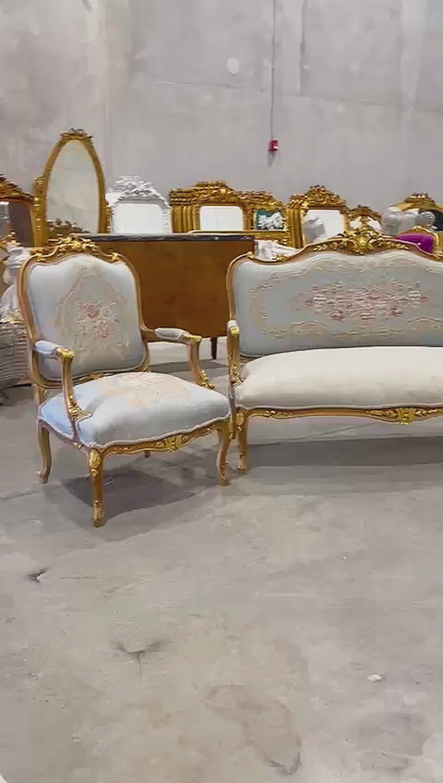 French Style Sofa Settee Sky Blue Color and Gold Leaf Details Sofa Furniture
