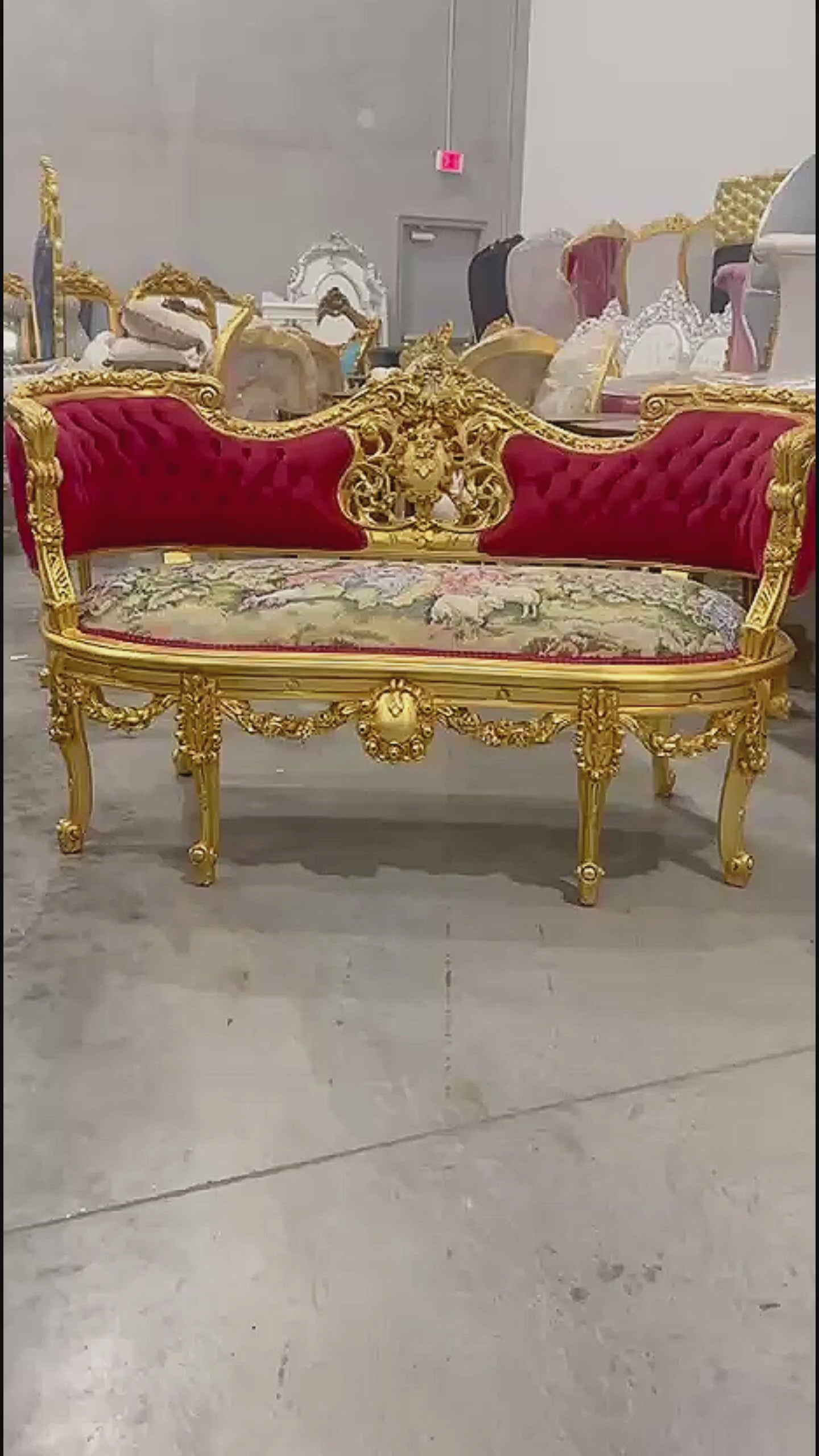 This vintage French-style art bench settee is a beautifully crafted piece that brings timeless elegance to any space. Upholstered in rich red velvet and adorned with intricate gold leaf detailing, it exudes antique charm and sophistication. Whether placed in an entryway, bedroom, or living room, this petite settee makes a stunning statement. Fully assembled and ready to elevate your décor, it’s a perfect blend of style, comfort, and classic design.